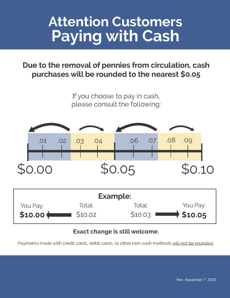 - Provide Notice: Businesses must clearly and conspicuously disclose their rounding method for cash purchases through prominent signage, such as posting a notice near cash registers or entrances. The Division has prepared a printable flyer explaining the recommended rounding method to assist you.